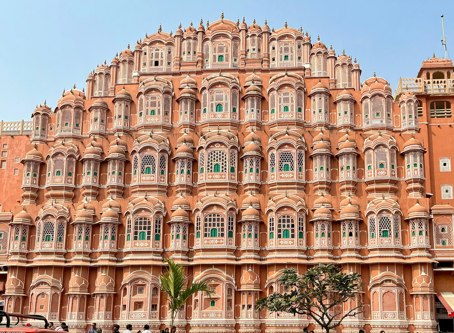 The iconic Hawa Mahal, or “Palace of Winds,” is an extraordinary five-story façade of pink sandstone adorned with hundreds of intricately carved jharokhas (small windows). This architectural marvel was designed to allow royal women to observe street festivals without being seen, blending privacy with elegance.