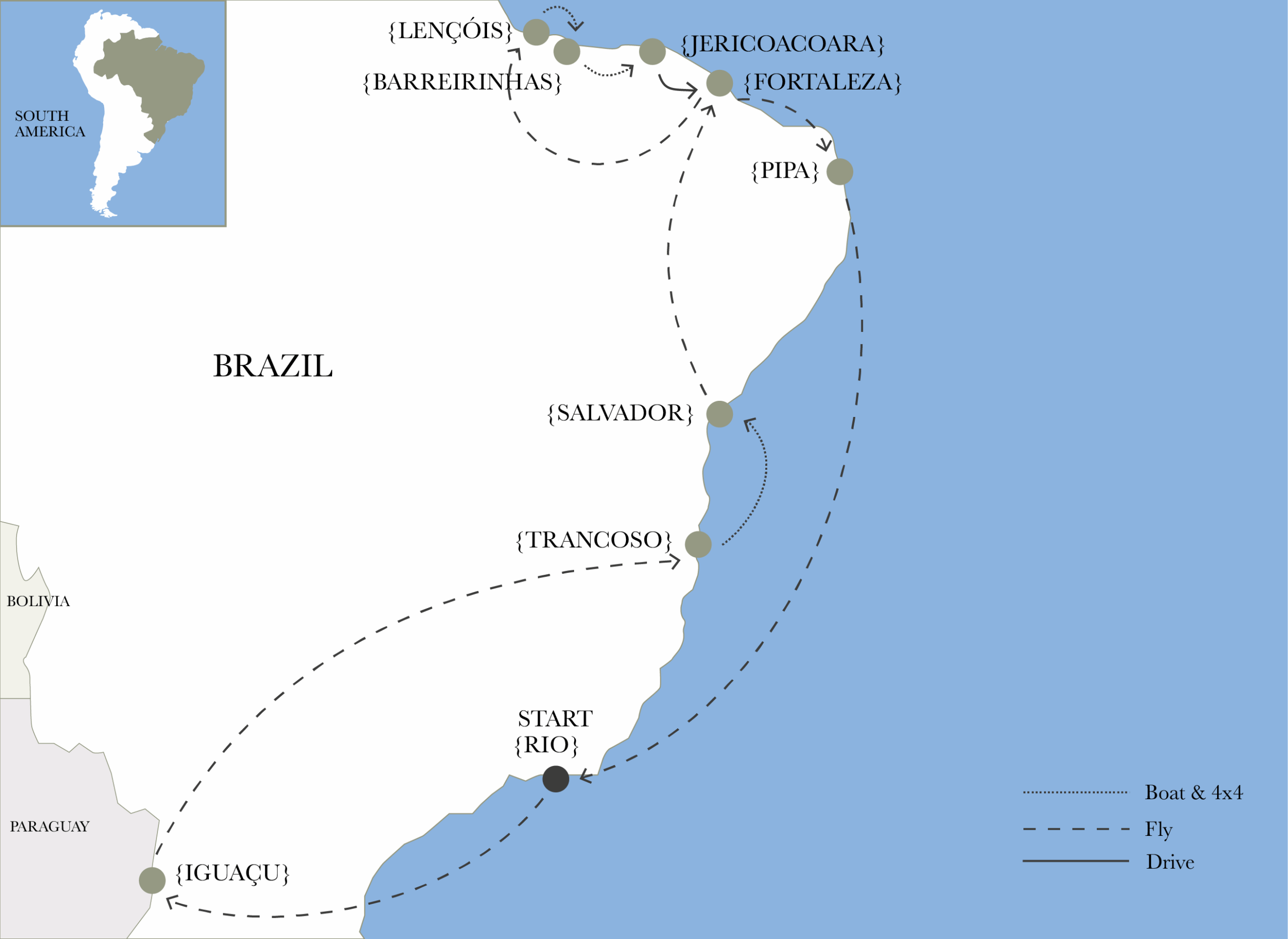 Brazil’s vastness meant we had to make some choices on what to see and what to miss. We decided to travel north from Rio along the coast, including a boho chic resort we’d read about called UXUA and a town called Jericoacoara that has streets made of sand. In terms of natural wonders, the Iguaçu falls were a must and we also wanted to adventure into the Lençóis Maranhenses National Park in the north to see the striking desert scenery. This itinerary meant we had to skip the southern beach towns like Búzios, the Pantanal wetlands and Sao Paulo.