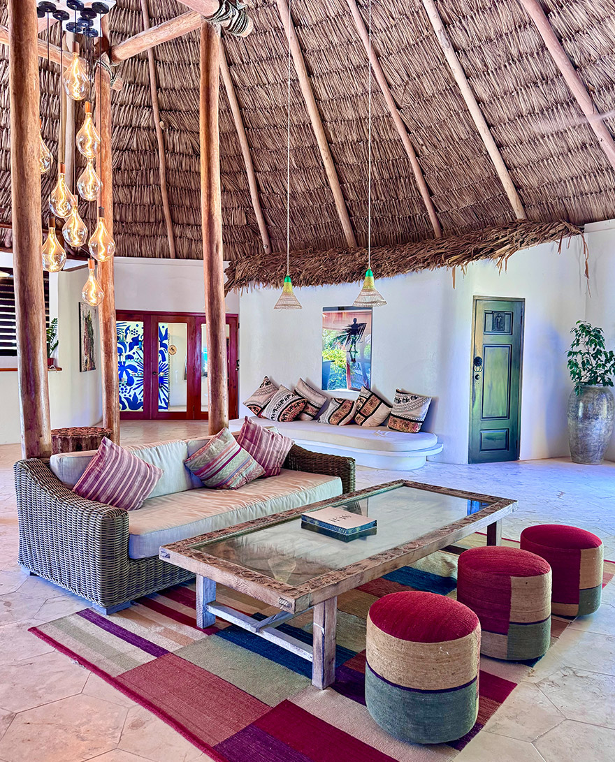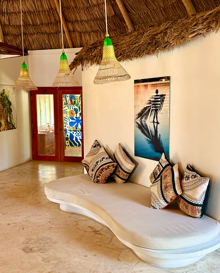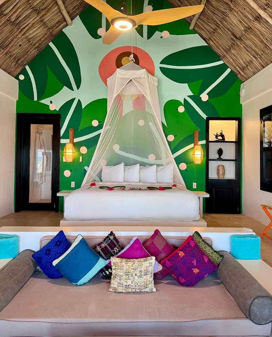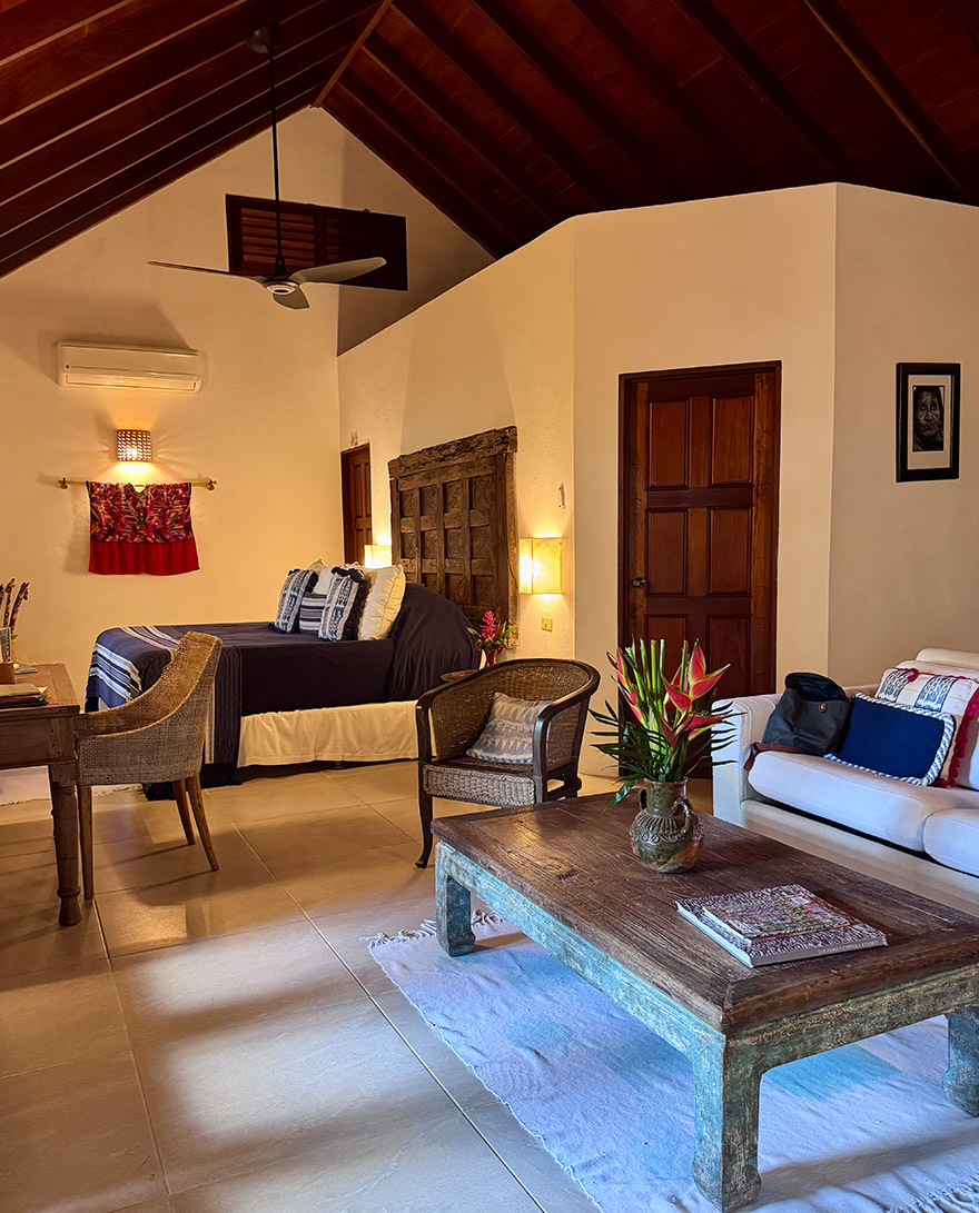 The individual casitas are colourful, thatched, and dotted along the beach and in the gardens. We went for one of the higher category beachfront ones, that allow you to step straight from bed to terrace to beach. Interiors are bright, breezy and colourful.