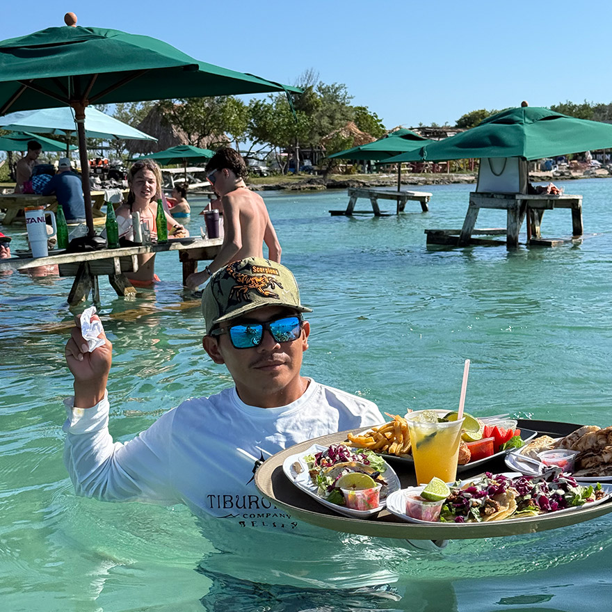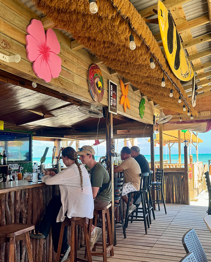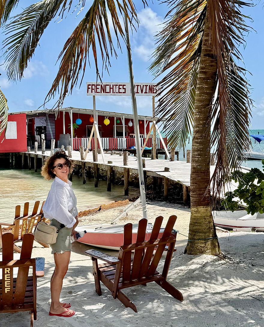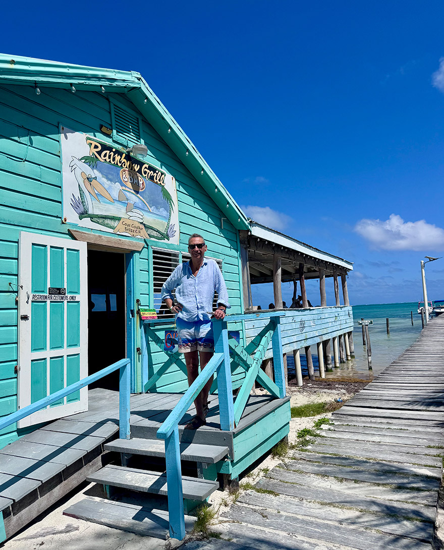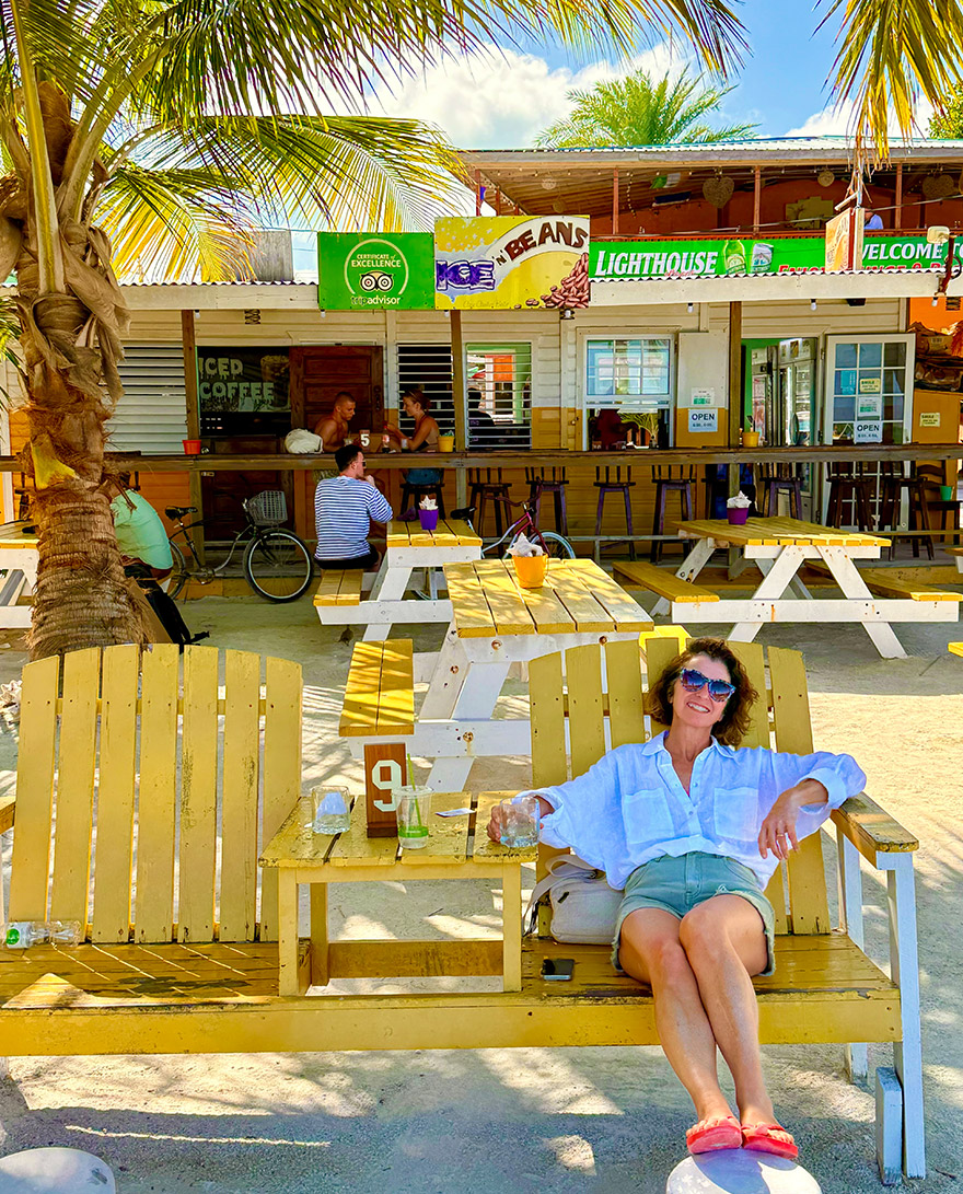 We hired a golf buggy, the main mode of transport on the Caye, and drove 30” to this spot. There is a line of lively little bars with tables in the sea that you wade out to, cold drinks, music, and a holiday mood that feels very Belize.
