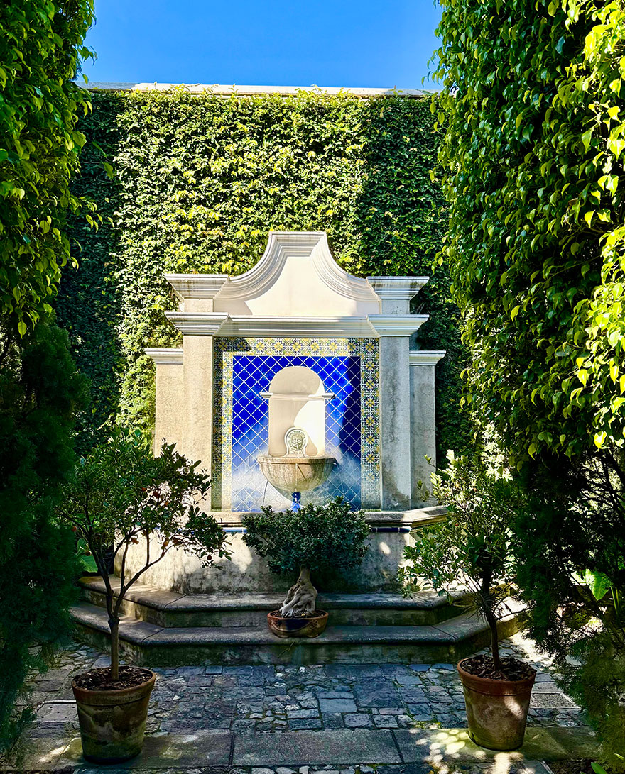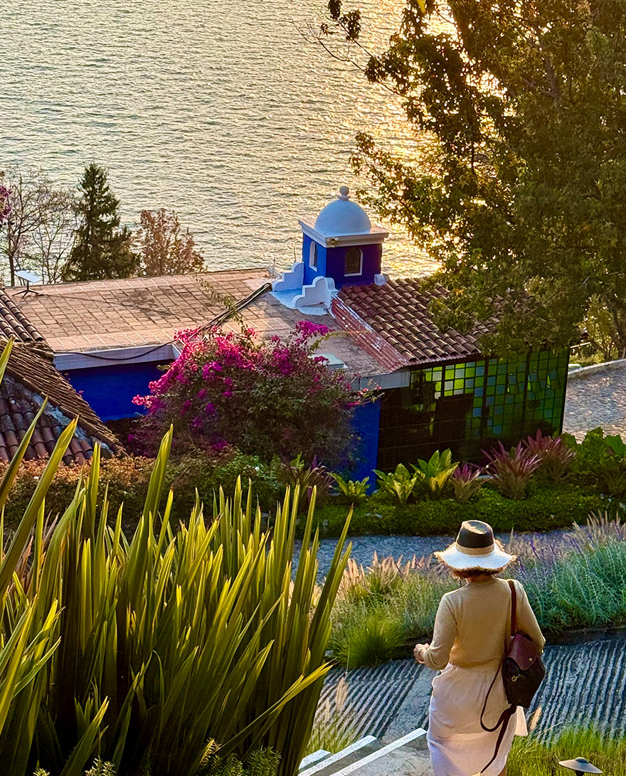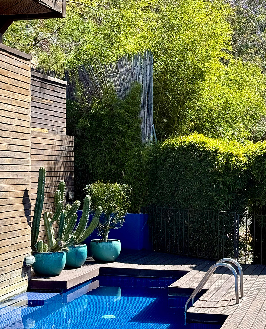 The setting is very different to San Rafael — more resort-like, with a turquoise outdoor pool, sweeping garden paths.