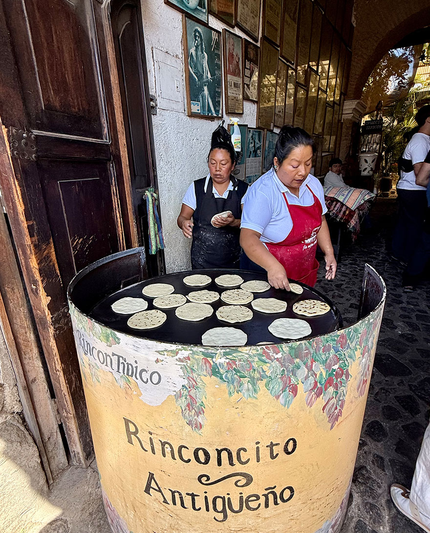 Rinconcito Antigueno is the kind of local place we always hope to find: simple, busy, and genuinely good. They do rotisserie chicken cooked in front of you and tortillas handmade by ladies right by the entrance. You queue up (it goes fast) seat yourself in central courtyard then go up to place your order.