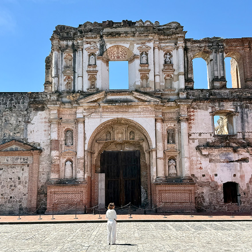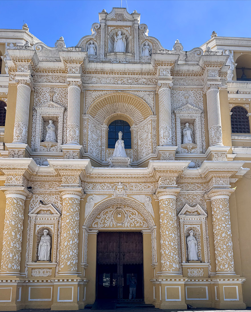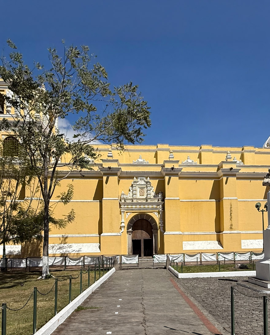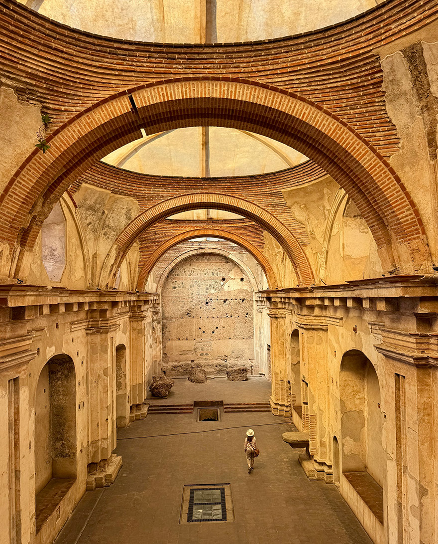 Today, there is a striking contrast between the grand, restored and formal exterior and the earthquake-damaged interior. The most striking moment is looking up and seeing where the domed cupolas once closed the space into a continuous ceiling. After the 1773 Guatemala earthquake, sections of the roof and dome collapsed, and in those breaks, the sky became part of the architecture.