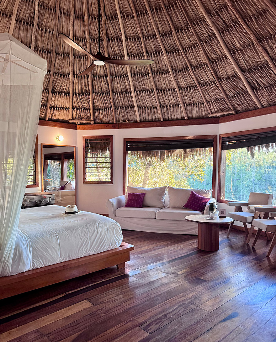 We also looked at Blancaneaux Lodge (another Coppola Hideaways property, and sister hotel to La Lancha). It’s more rustic and “classic jungle lodge” in feel than Gaïa, with 20 villas and cabanas dotted along the Privasson River. It has a strong sense of atmosphere with sounds of the waterfalls and jungle. However, we chose Gaïa for the views and the combination of boutique scale and polished comfort.