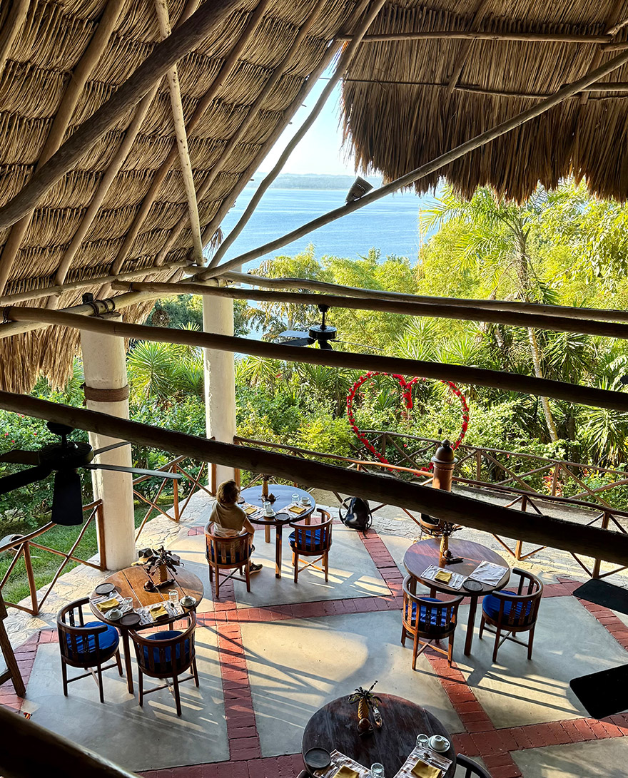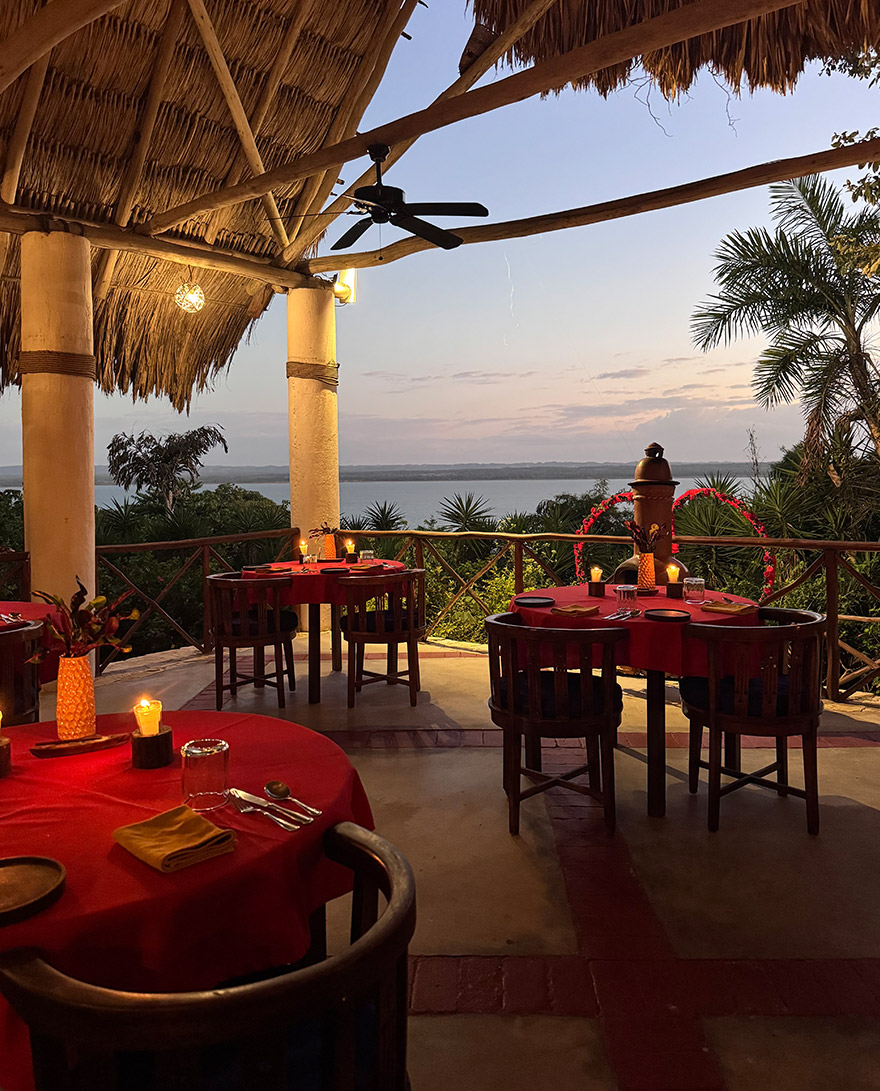 The open-air restaurant at La Lancha has a lovely, elevated position looking out over the rainforest canopy and Lake Petén Itzá beyond — especially atmospheric at sunset when the light drops behind the trees. The menu focuses on local Guatemalan dishes and regional ingredients, cooked with care and given a few thoughtful, creative touches.