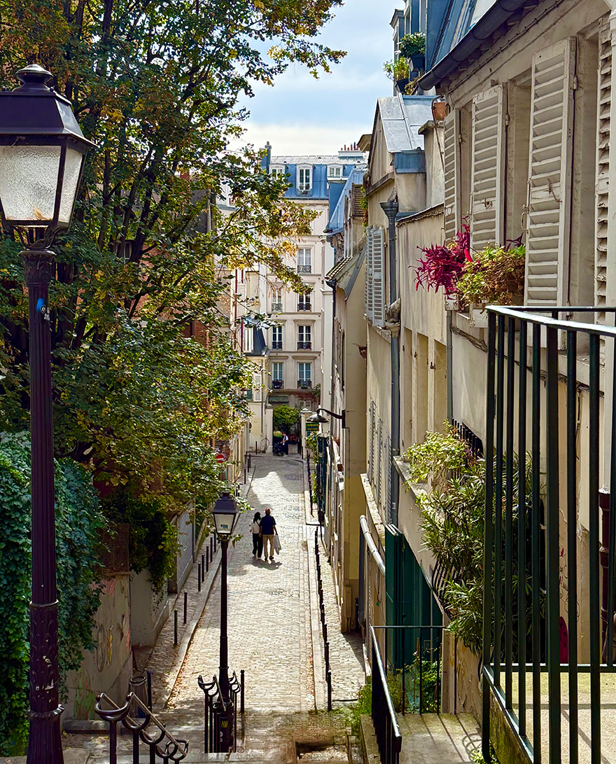 Walk on from the café, and Rue Girardon curves round and becomes Rue de l’Abreuvoir. Here, you have a lovely view up the hill towards the Sacre Coeur.